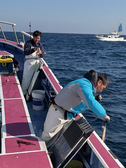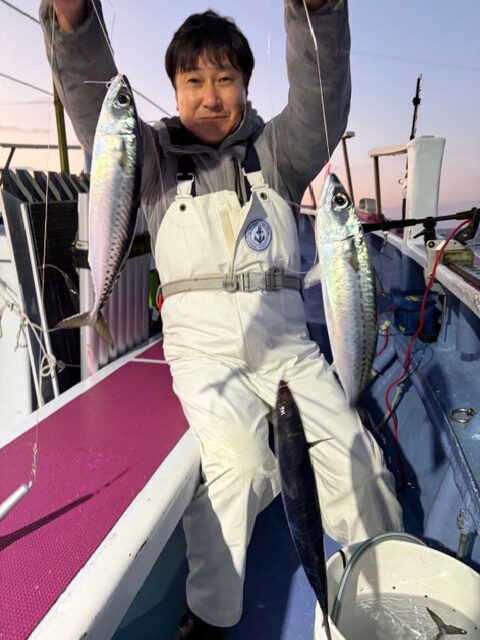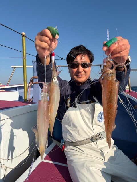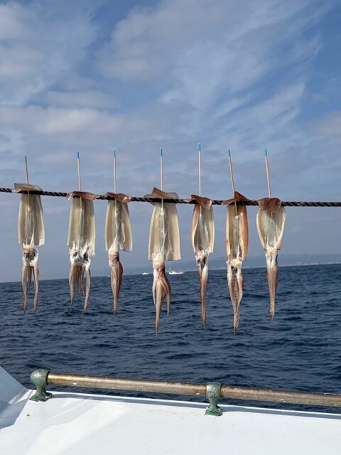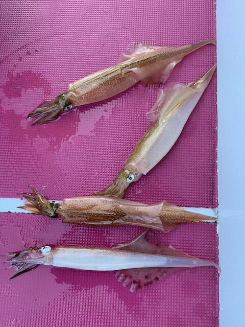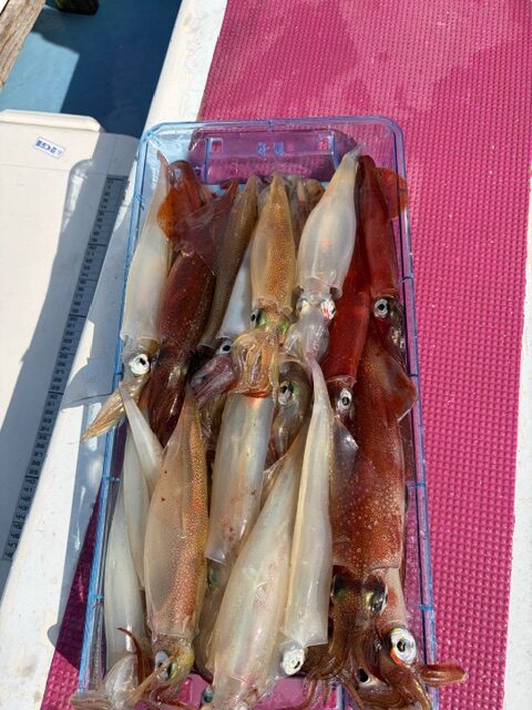 勝浦沖140~200m前後 サバ 27~40cm 8~25ハイ ヤリイカ 23~42cm 9~30パイ 早朝のサバはマサバ8割 小、中型主体のヤリイカにスルメが1~10パイ混ざりました。