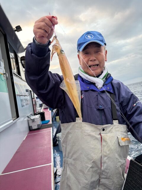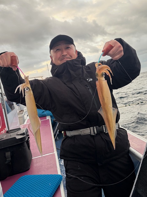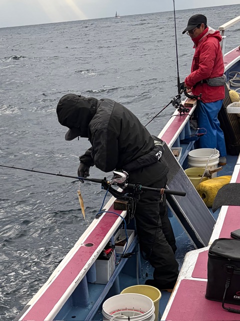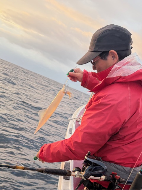勝浦沖180m前後 25=45cm 5~30パイ 良型中心に平均20パイ ウネリでバラシ多かったがポツポツと釣れました。 朝の内が良かったようです。 スルメ1~14ハイ混ざりました。 予想外の雨で今日は沖干しは無いようです。
